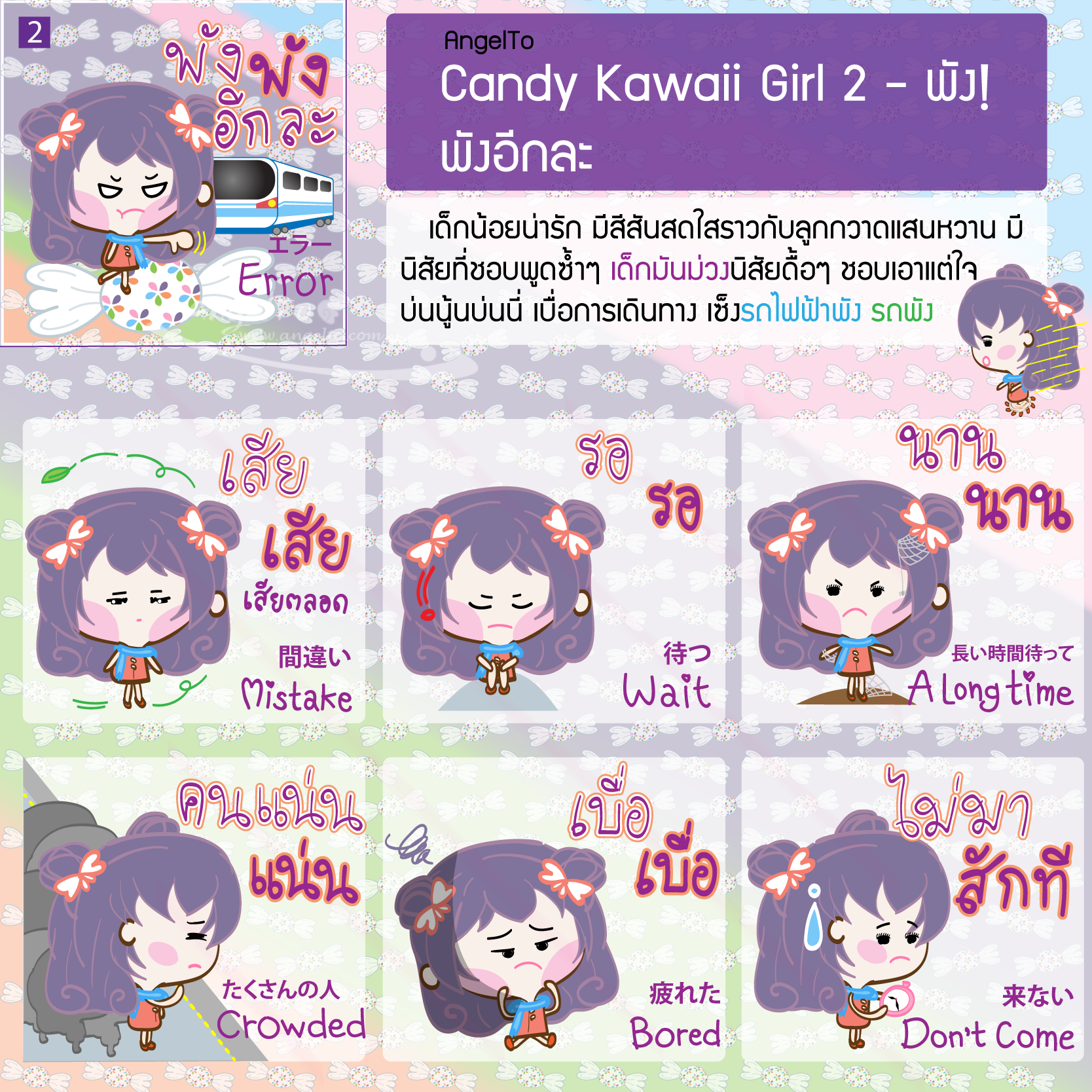 Candy Kawaii Girl 2 พัง! พังอีกละ เด็กน้อยน่ารัก มีสีสันสดใสราวกับลูกกวาดแสนหวาน มีนิสัยที่ชอบพูดซ้ำๆ เด็กมันม่วงนิสัยดื้อๆ เกเร ชอบเอาแต่ใจ บ่นนู้นบ่นนี่ เบื่อการเดินทาง เซ็งรถไฟฟ้าพัง รถพัง